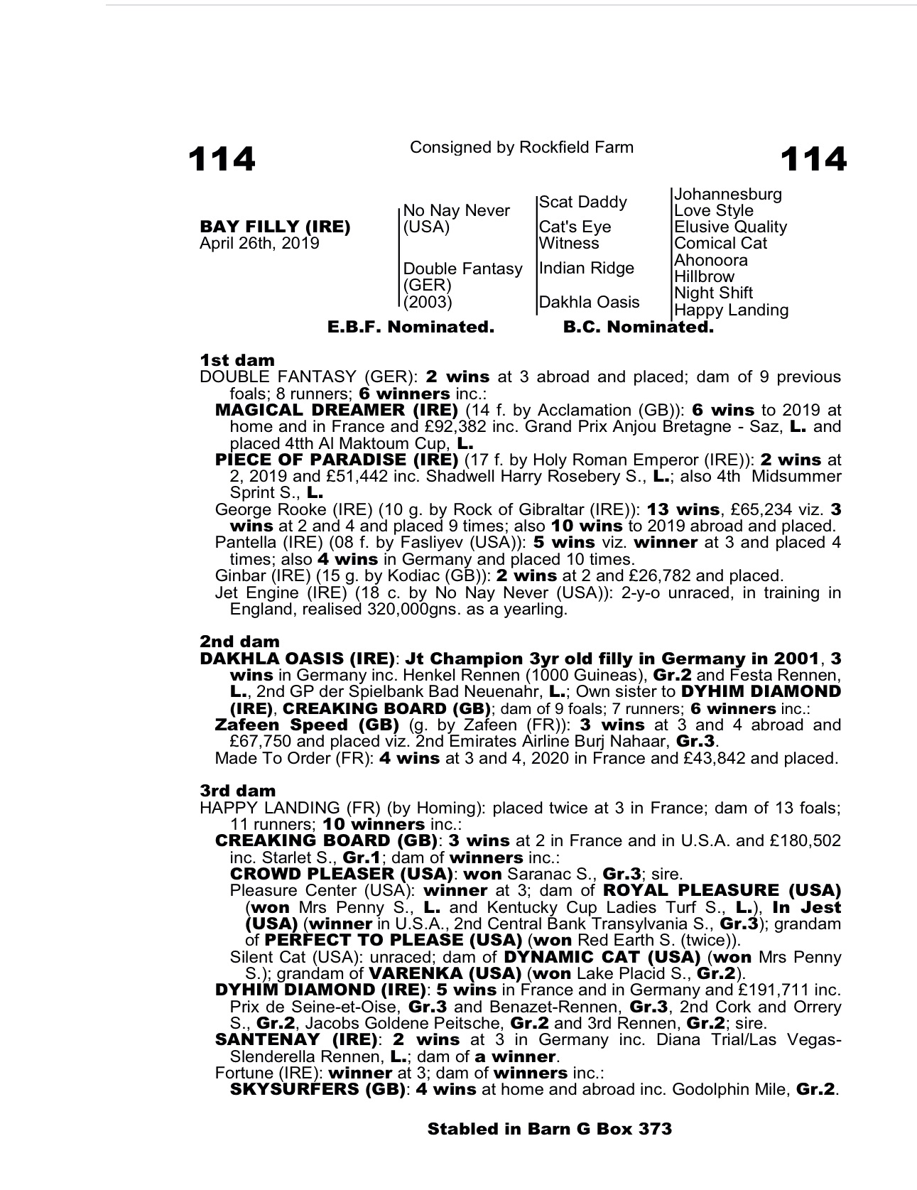 This filly is the newest addition to the FRED ARCHER RACING team of horses. She is by No Nay Never out of Double Fantasy and is a half sister to two Stakes winners. She is a half sister to MAGICAL DREAMER who won five times for the FAR-Ladylove Syndicate.